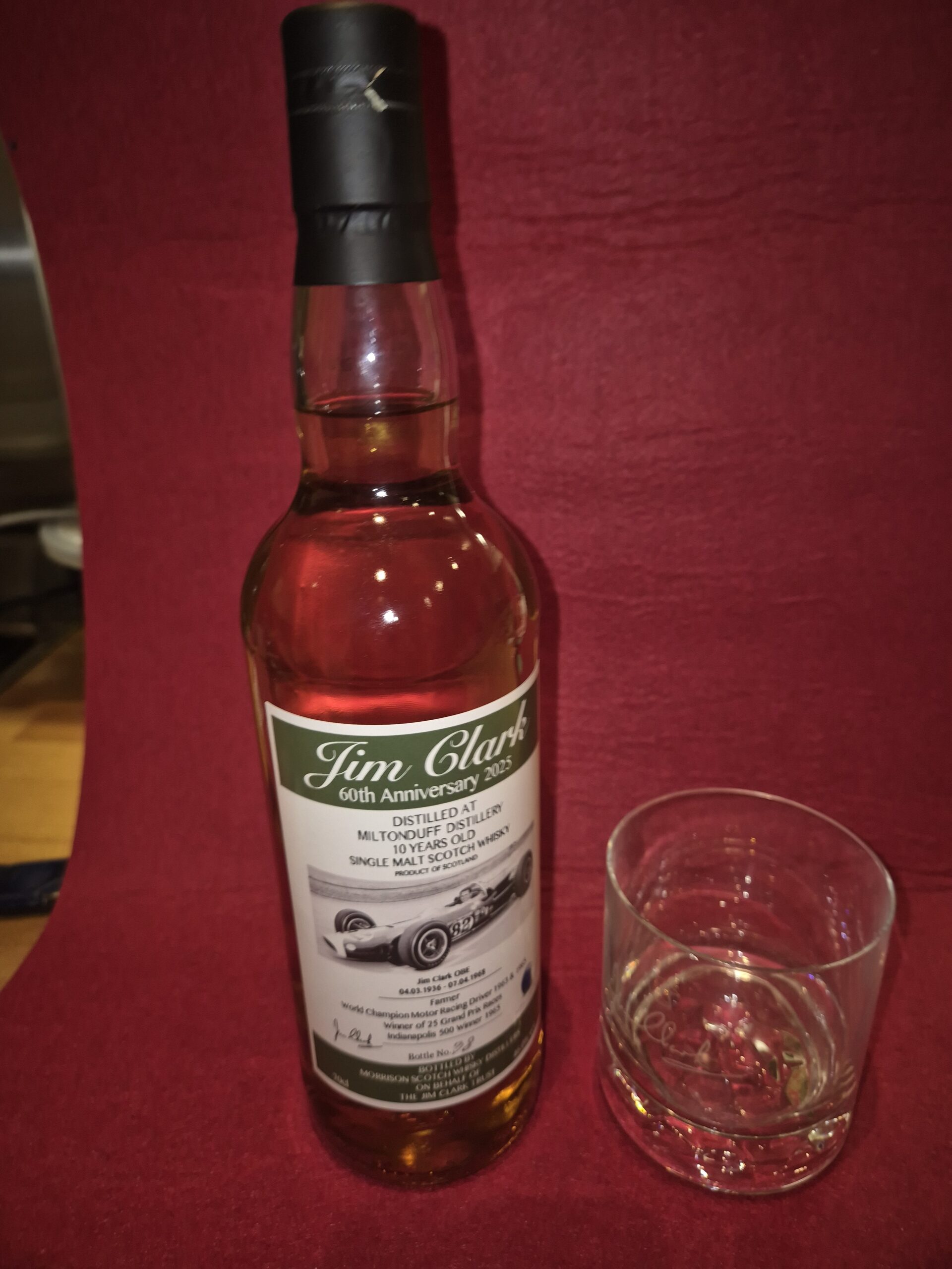 This 10-year-old Single Malt Scotch Whisky, distilled at the renowned Miltonduff Distillery, has been exclusively bottled by Morrison Scotch Whisky Distillers Ltd on behalf of the Jim Clark Trust. Crafted with care and selected for its character, this release pays tribute to a champion known for precision, skill, and timeless elegance.