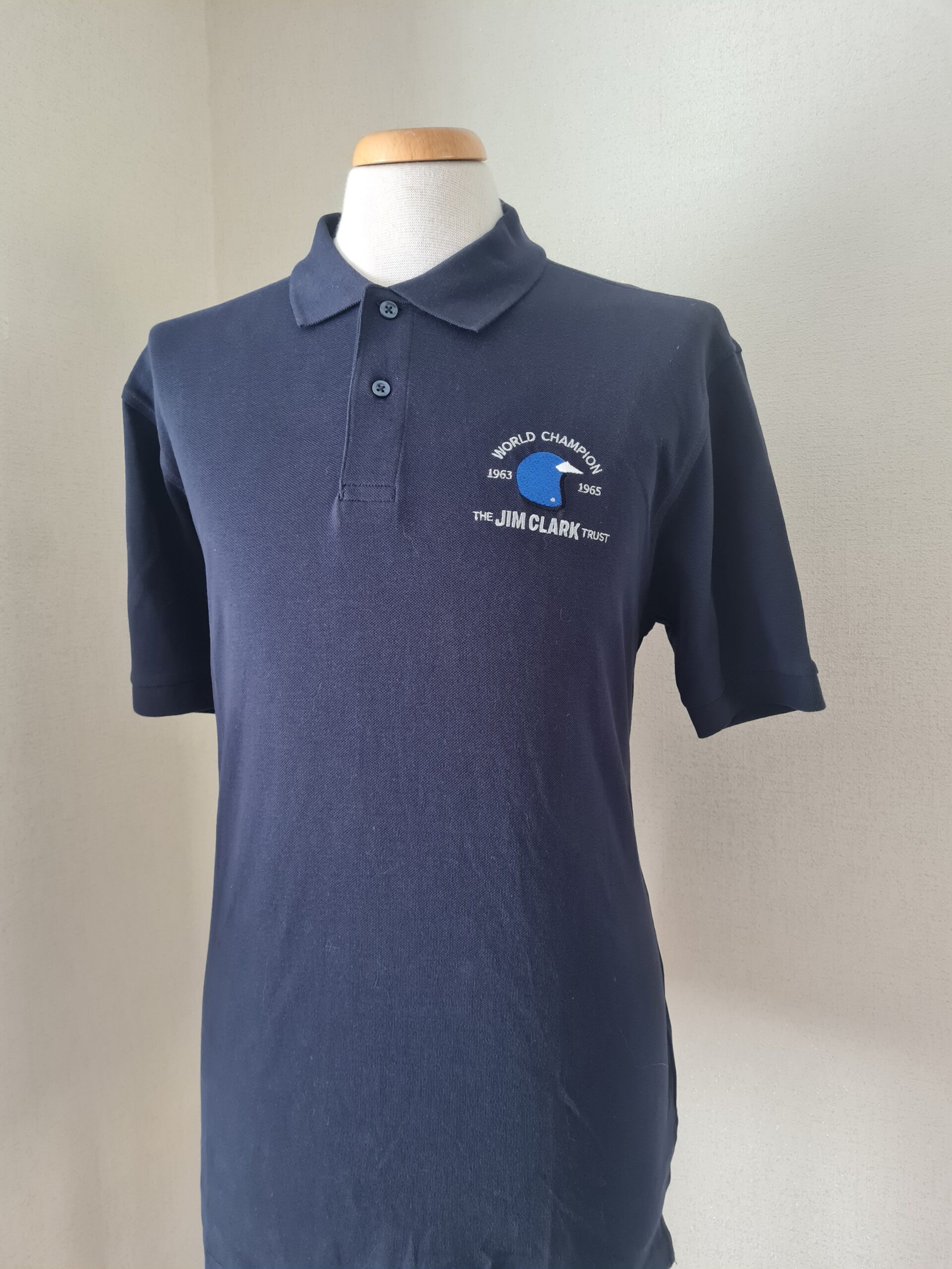 JCT Navy Polo Shirt featuring new Jim Clark Trust logo with World Champion 1963 and 1965