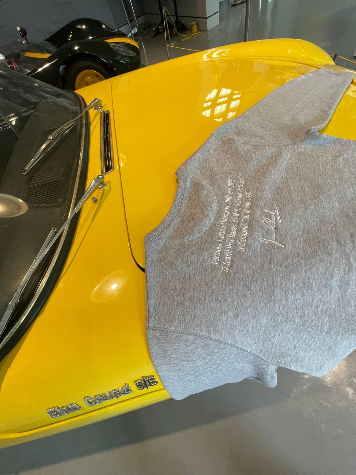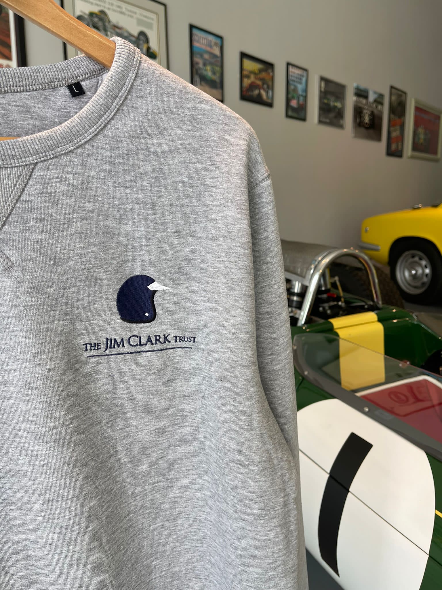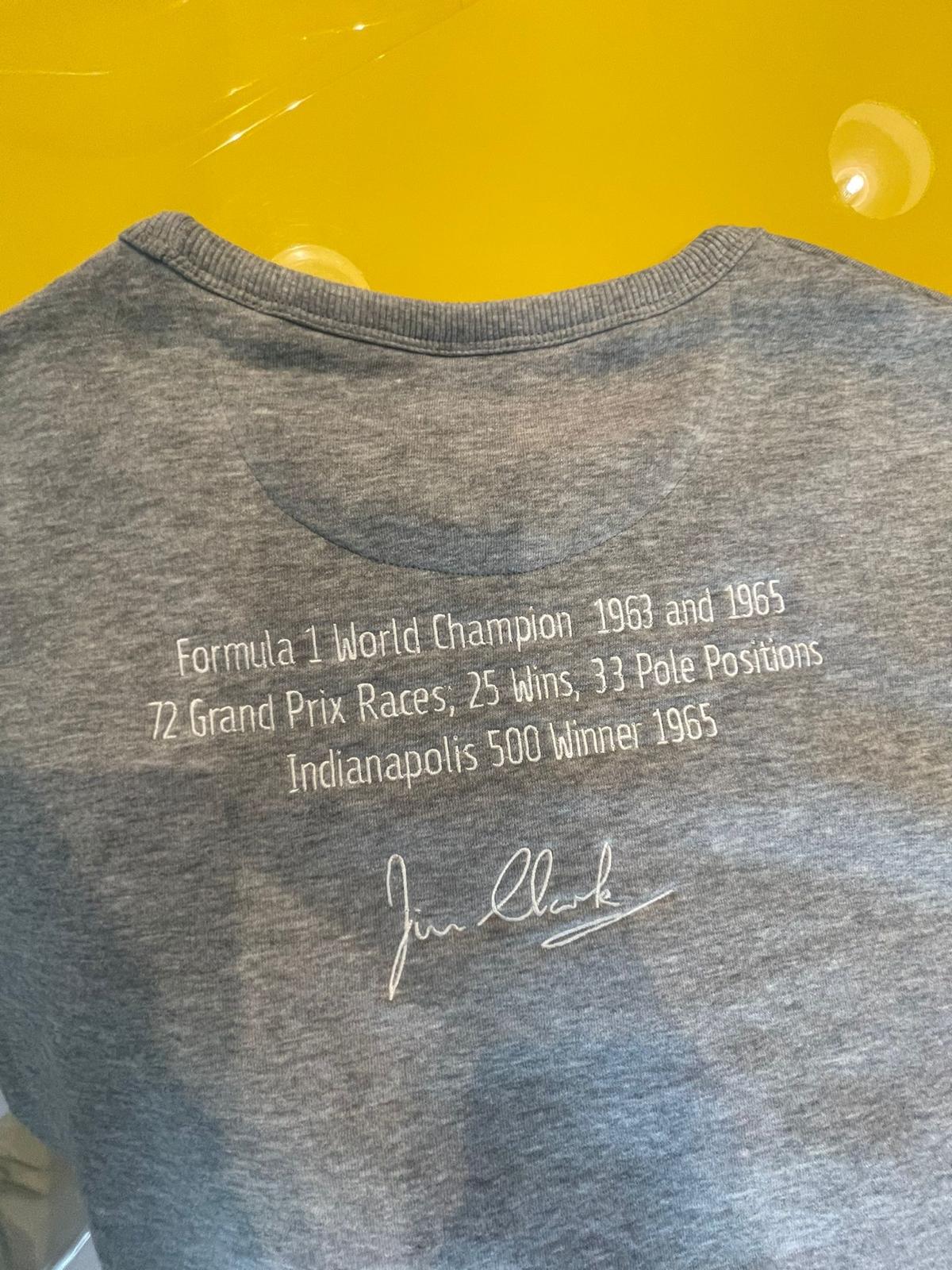 The Jim Clark Trust Sweatshirt features our embroidered logo on the chest, as well as Jim’s achievements embroidered on the back. Jim Clark’s signature is also printed on the sleeve.