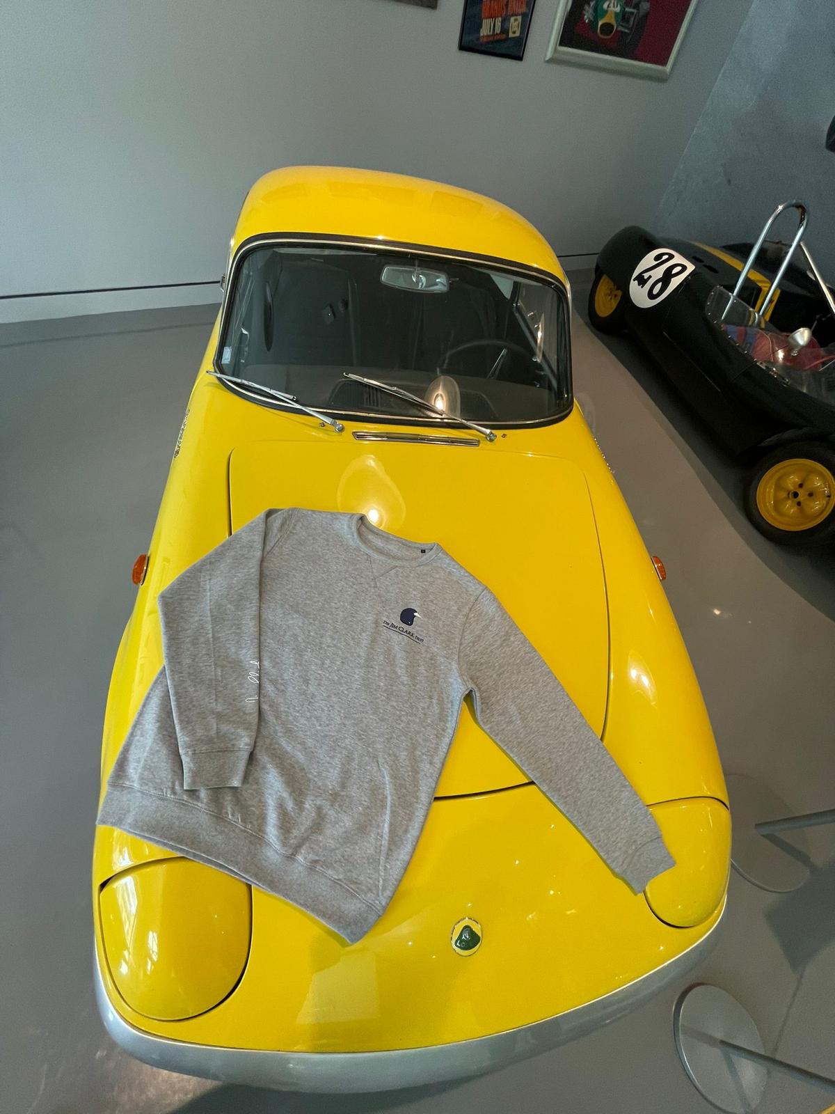 The Jim Clark Trust Sweatshirt features our embroidered logo on the chest, as well as Jim's achievements embroidered on the back. Jim Clark's signature is also printed on the sleeve.