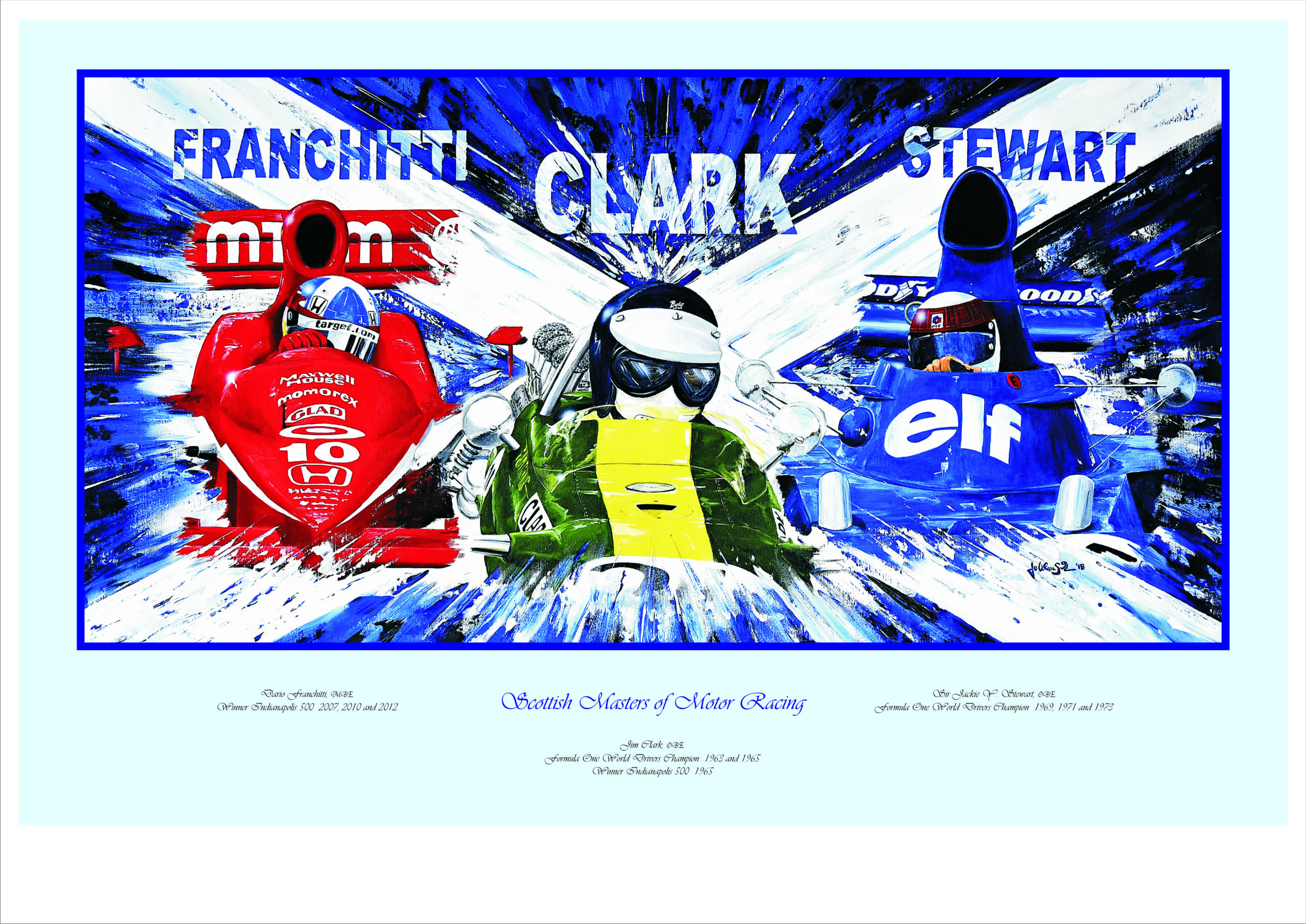 Limited Edition Art Print painted by German artist Jo Klausmann showing Scotlands most successful Racing Drivers: Jim Clark OBE, Sir Jackie Stewart OBE and Dario Franchitti MBE in a dramatic painting full of speed and energy.