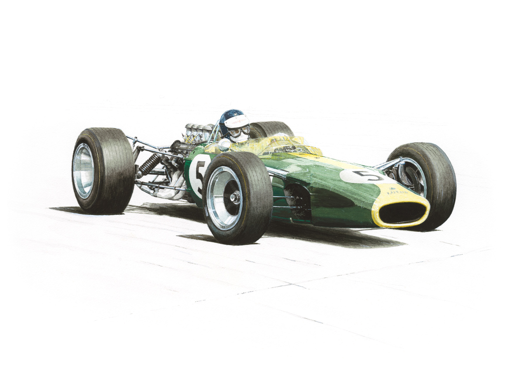 - Print Number 1: Fine art print of Jim Clark driving the Lotus 49 at the 1967 British Grand Prix at Silverstone. Limited edition prints on 300gms paper hand signed and numbered by the artist