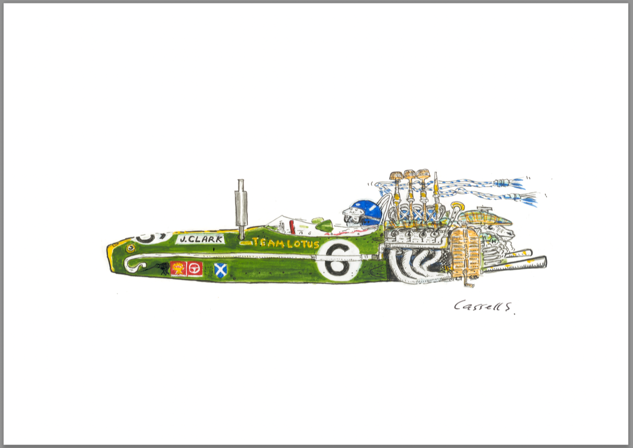 The print brings together a few well known pastimes of Jim Clark and is a charming nod to his life and career.