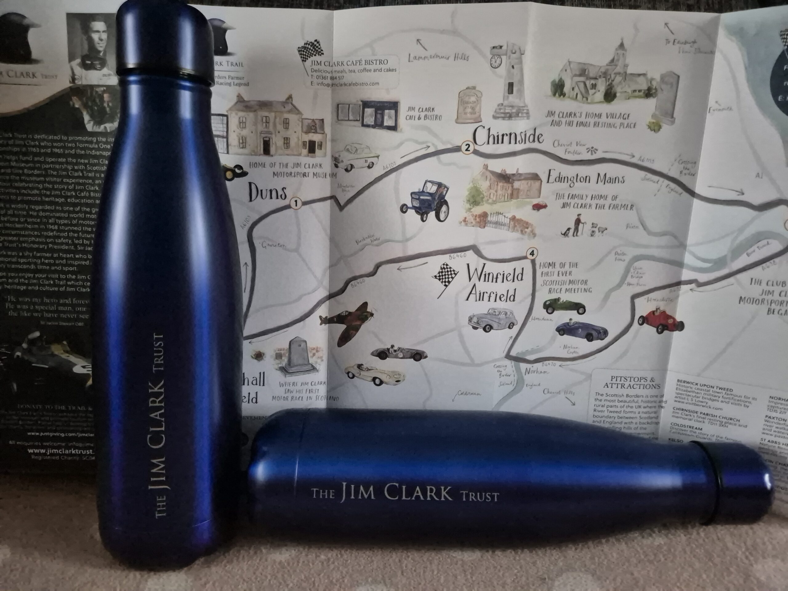 - Shapely, on-trend double-walled stainless steel bottles with Jim Clark Trust printed on it